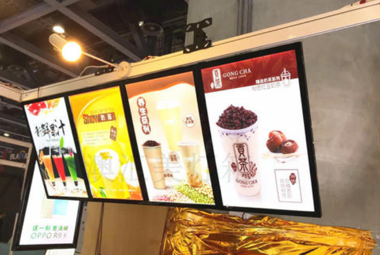 點餐燈箱的常規尺寸為60cm*50cm,在高度60cm不變的情況下,寬度可定制,可做平面和弧面,也可做單面、雙面和三面,雙面和三面可旋轉,比如壹些經營早中晚快餐的門店,就無需更換畫面,直接旋轉使用。